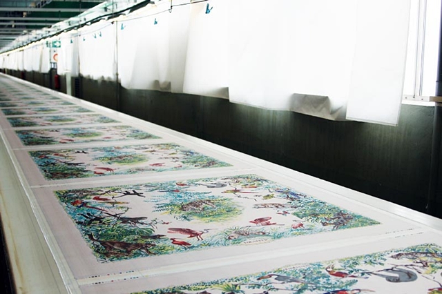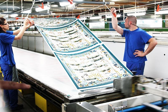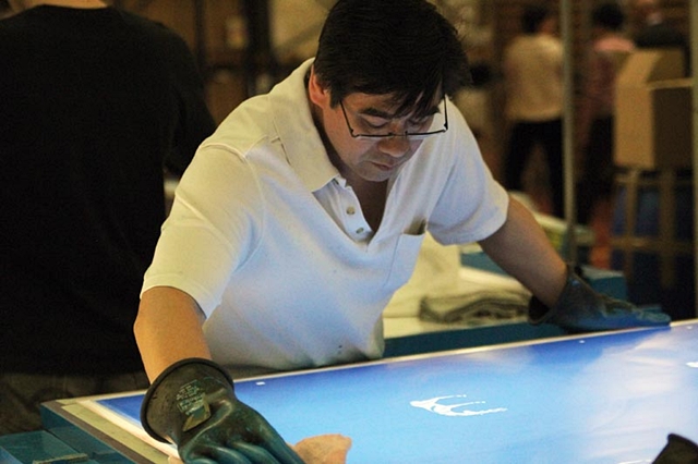 Trong quá trình in, người thợ phải liên tục kiểm tra để đảm bảo đủ lượng mực in, sự thẩm thấu của màu mực và để chắc chắn rằng các khung in nằm đúng vị trí của nó. Nếu được chứng kiến công đoạn này, bạn sẽ thấy vô cùng thích thú khi hoạ tiết trên khăn hiện rõ dần lên sau mỗi lần áp dụng khung phim. Khi quá trình in hoàn tất, dải lụa phơi khô ngay trên bàn in, sẽ được nhấc lên cao, chuyển sang phòng giặt để rũ bỏ phần màu chưa khô, hồ dính, và để đạt được độ mềm mại theo đúng yêu cầu.
