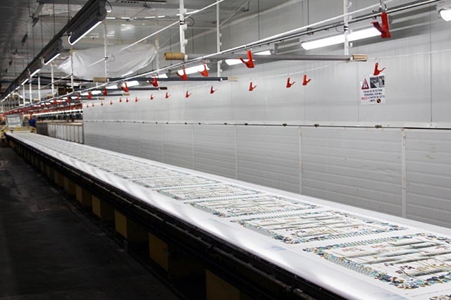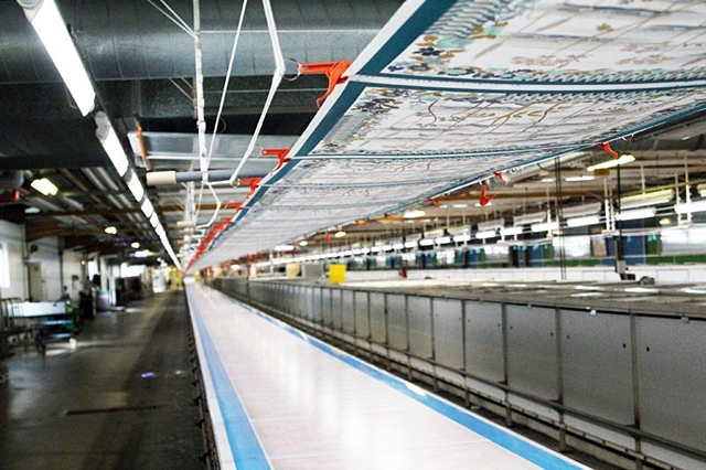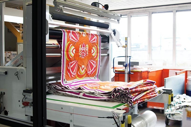 Phần đặc biệt nhất, có một không hai của nhà Hermès: bàn in lụa dài 150 mét, hoạt động hết công suất 24 giờ một ngày, tất cả các ngày trong tuần (điều cực kì hiếm hoi ở Pháp). Dải lụa được gắn lên bàn in bằng một loạt keo đặc biệt để tránh dịch chuyển trong quá trình in. Từng khung phim một được áp dụng với từng màu tương ứng, theo trình tự từ những nét vẽ thanh nhất (như đường viền) sang những phần rộng hơn và từ màu tối sang màu sáng.