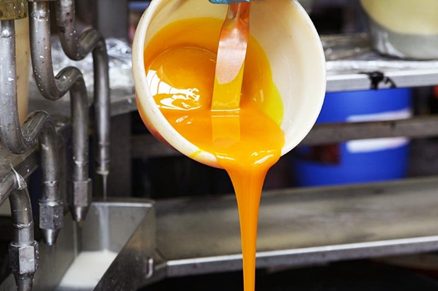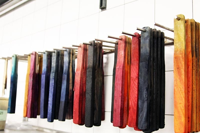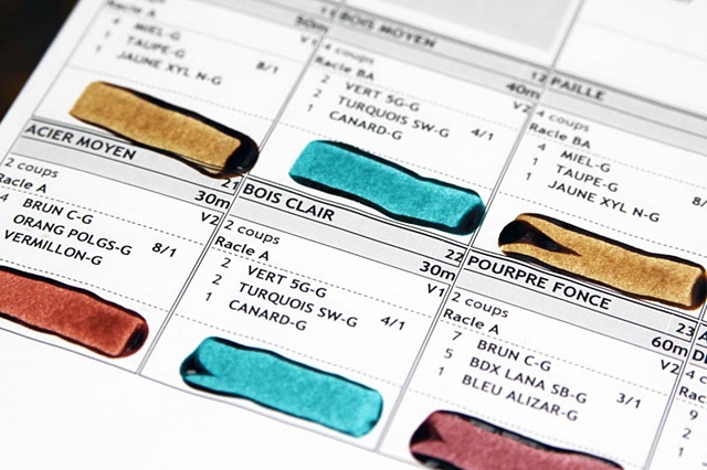 Khi tất cả các màu đã được thống nhất, từ 40 bột màu nhuộm cơ bản, người thợ thủ công sẽ pha màu theo công thức của nghệ nhân màu (số màu pha được theo các công thức này có thể lên đến 75.000 màu). Trong “bếp pha màu”, họ nấu hỗn hợp màu nhuộm với keo dính từ nhựa cây trong nồi lớn, sau đó thẩm định lại màu một lần nữa bằng con mắt dạn dày kinh nghiệm của chính mình.