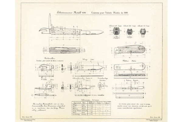 Một trong những con dao Modell 1890 được quân đội Thụy Sỹ đặt một công ty ở Đức sản xuất năm 1890, bao gồm một lưỡi dao sắc, dao khoét, mở lon và tuốc nơ vít.