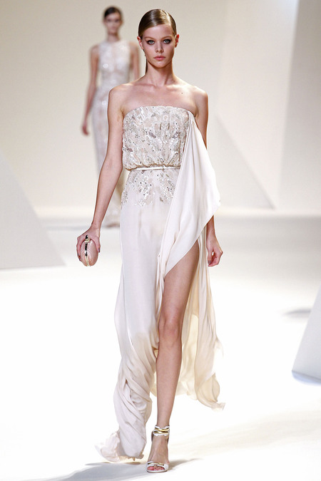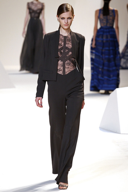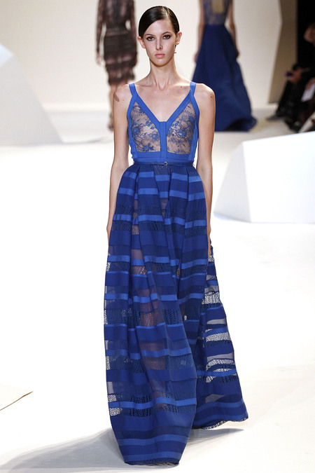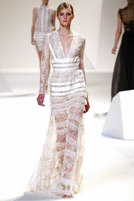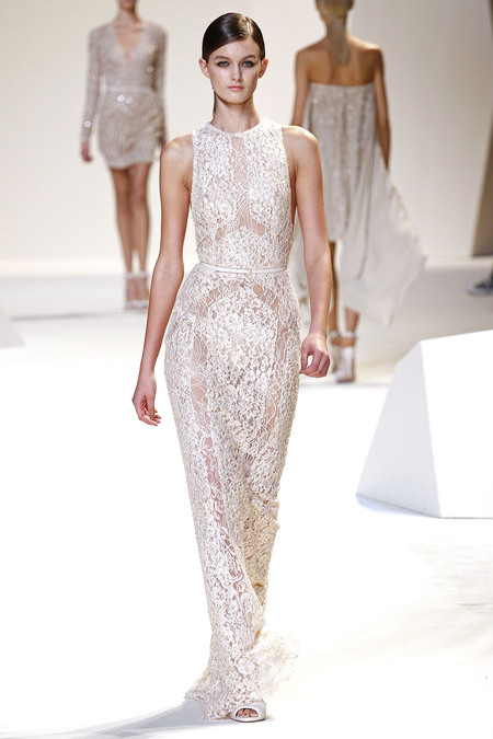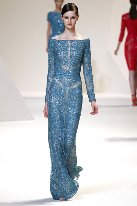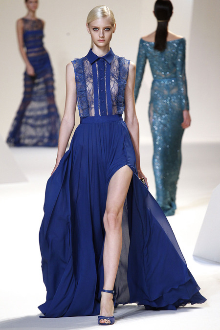 Elie Saab cũng đã thể hiện đẳng cấp của mình qua những bộ đầm dài thướt tha với chất liệu voan nhẹ kết hợp với ren cao cấp và không ngần ngại phô trương vẻ gợi cảm với những đường xẻ chân váy cao táo bạo hay những chiếc váy gần như hoàn toàn là ren xuyên thấu.