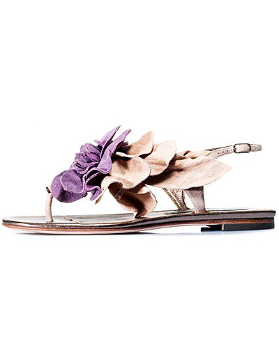 Ở BST giày này, ông chú trọng tạo điểm nhấn ở phần gót giày. Không thanh mảnh, thon nuột, Gaetano Perrone mang đến một hơi thở lạ lẫm trong những mẫu thiết kế giày với phần gót dày dặn. Những viên đá quý, kim loại cứng, kết nên hình dáng những bông hoa hải đường sáng loáng. Chúng tựa hồ như trăm hoa đua nở từ gót chân son của thiếu nữ. Bên cạnh đó, chất liệu da lộn gam màu phai được xếp nếp tạo thành hình đóa hồng kiêu sa.
