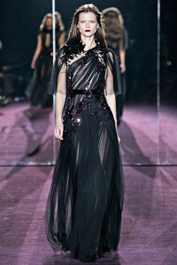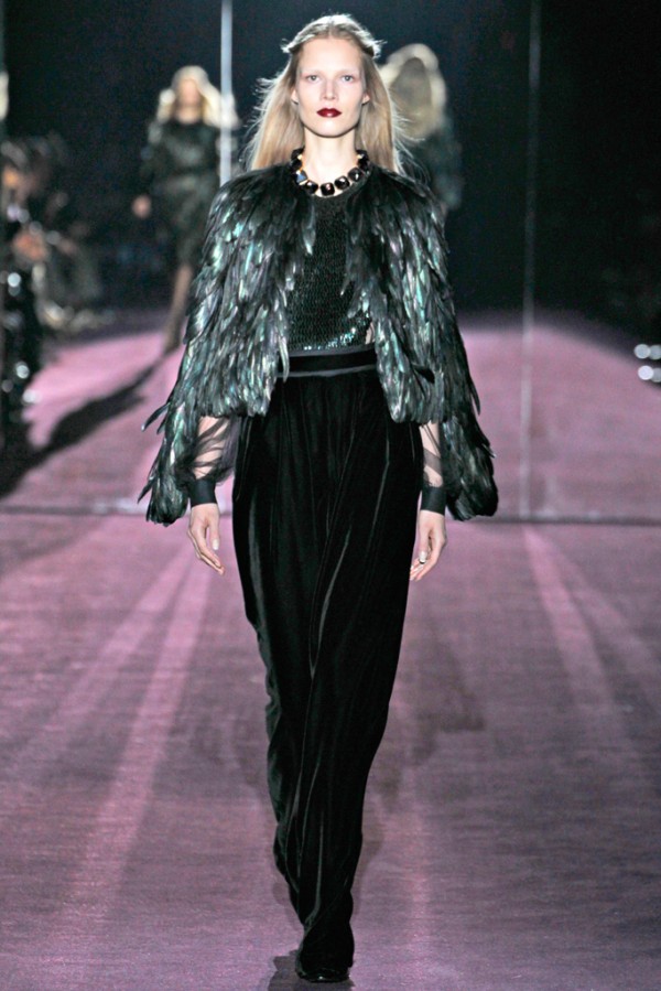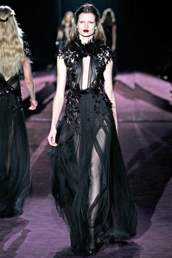 Tính lãng mạn của bộ sưu tập có thể dễ dàng tìm thấy ở những chiếc áo cánh trong suốt đầy khêu gợi, điểm hoa văn nhung gấm, kết hợp với chi tiết ống tay áo rộng theo trường phái Pre Raphaelite, những nếp cuộn được sắp xếp một cách nghệ thuật trên vạt áo. Váy phần lớn được xẻ dọc, đôi khi xuất hiện những đường xẻ sâu trên thân áo đi kèm với váy được xẻ cao lên đùi. Ngoài ra không thể không nói đến những điểm “quái” trong bộ sưu tập với những chiếc áo, váy được phủ hoàn toàn bởi lông vũ bóng.
