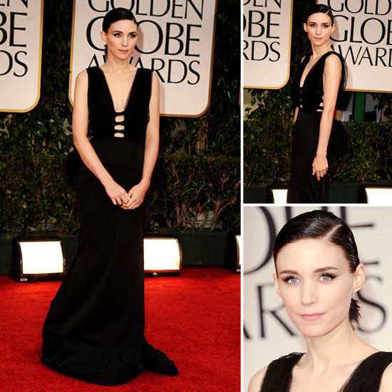 Chọn một trong những kiểu dáng “nóng” nhất của nhãn hiệu Nina Ricci trong mùa thu 2012, Rooney Mara trông quý phái trong bộ đầm dài màu đen cổ khoét sâu với chân váy đuôi cá tuyệt đẹp.