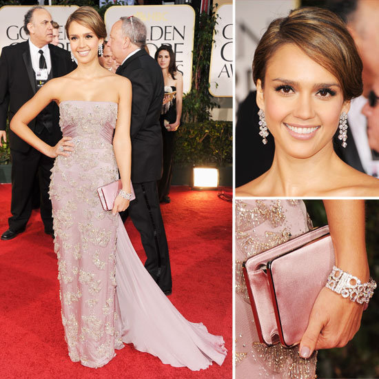 Cũng chọn đầm hở vai làm trang phục xuất hiện trên thảm đỏ Quả cầu vàng nhưng Jessica Alba trông thật nền nã, quyến rũ với chiếc đầm màu hoa oải hương nhạt của hãng Gucci cùng chiếc ví tiệp màu.