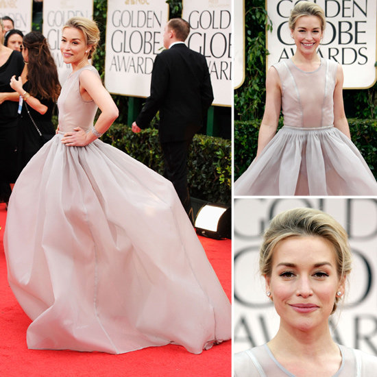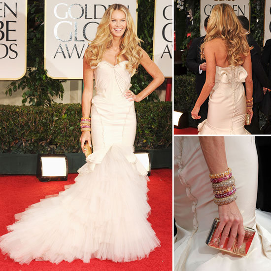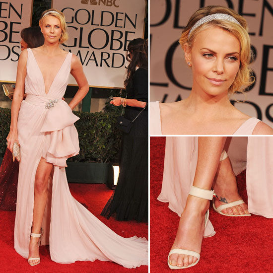 Được đề cử nữ diễn viên xuất sắc ở thể loại hài/ca nhạc trong phim Young Adult (Người trẻ tuổi), Charlize Theron xuất hiện với mái tóc xoăn vàng cổ điển và bộ đầm đuôi dài, thắt eo mềm mại, thanh lịch của Dior Couture. Phần chân đầm phía trước được cắt cúp ngắn đối lập với phần đuôi dài tha thướt phía sau một cách hoàn hảo để người đẹp khoe đôi giày hiệu Givenchy hợp tông với màu áo đầm. Trông cô thật dịu dàng và quyến rũ.