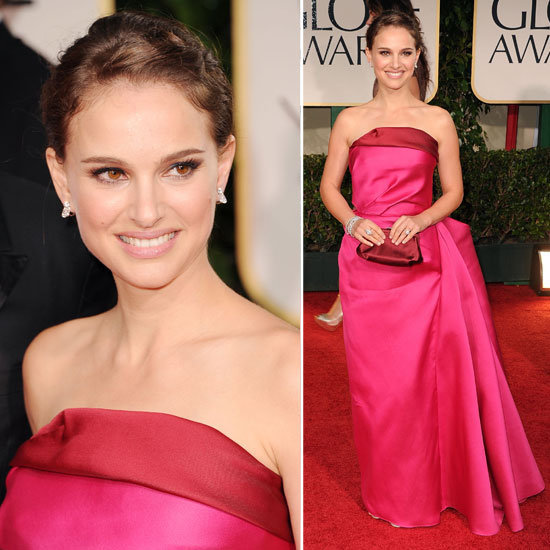 Xuất hiện lần đầu tiên trên thảm đỏ kể từ khi sinh con, Natalie Portman nhanh chóng thu hút sự chú ý bằng sự kết hợp màu sắc trang phục nổi bật. Cô đã chọn một chiếc đầm hở vai màu hồng đậm của hãng Lanvin với một nếp viền cổ màu đỏ cùng tông màu với chiếc ví. “Thiên nga đen” cũng đeo đồ trang sức của hãng Harry Winston.