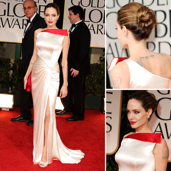 Như thường lệ, Angelina Jolie trông nổi bật với bộ đầm dài thanh lịch cổ điển của nhãn hiệu Versace có phần cổ bẻ màu đỏ.