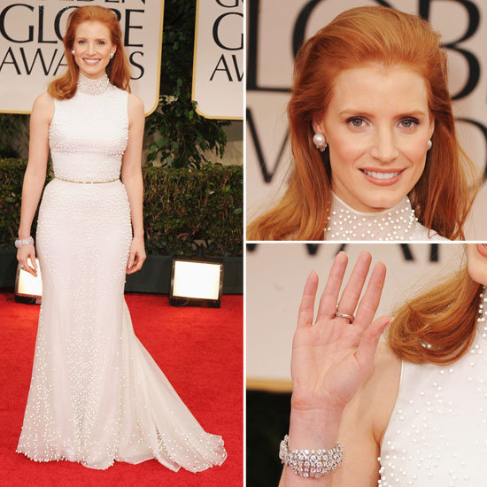 Nữ diễn viên Jessica Chastain trông thật thanh lịch với bộ váy trắng cổ cao của Givenchy cùng bộ trang sức trị giá hơn 1 triệu USD của hãng Harry Winston bao gồm đôi hoa tai ngọc trai, chiếc nhẫn kim cương và chiếc vòng tay kim cương cổ điển.
