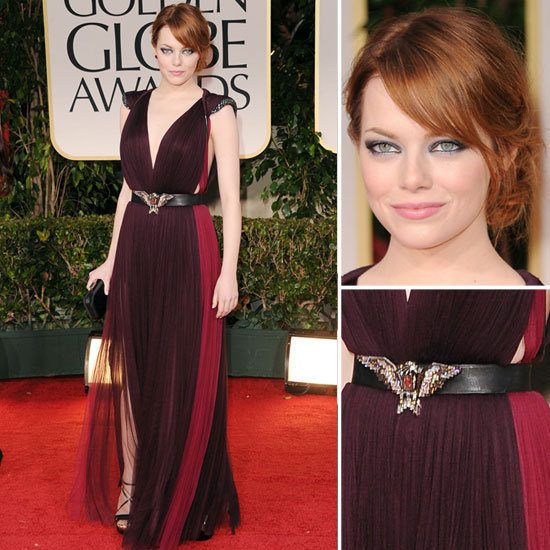 Chiếc váy xẻ sâu màu đỏ đậm của hãng Lanvin càng tôn thêm vóc dáng và làn da trắng của Emma Stone khiến cô trông như một nữ thần Hi Lạp. Tông màu đỏ sẫm của bộ đầm dạ tiệc như khiến không khí náo nhiệt màu sắc trên thảm đỏ trầm lắng lại, cân bằng gam màu tối và sáng.