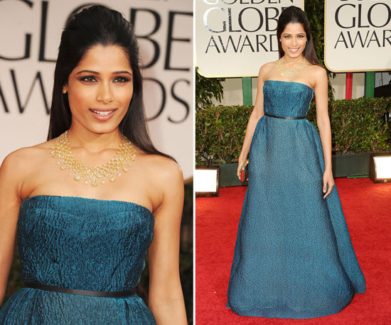 Freida Pinto đã chọn bộ đầm hở vai của Prada khi xuất hiện trên thảm đỏ Quả cầu vàng, kết hợp với sợi dây chuyền vàng đính đá quý của hãng Chopard.