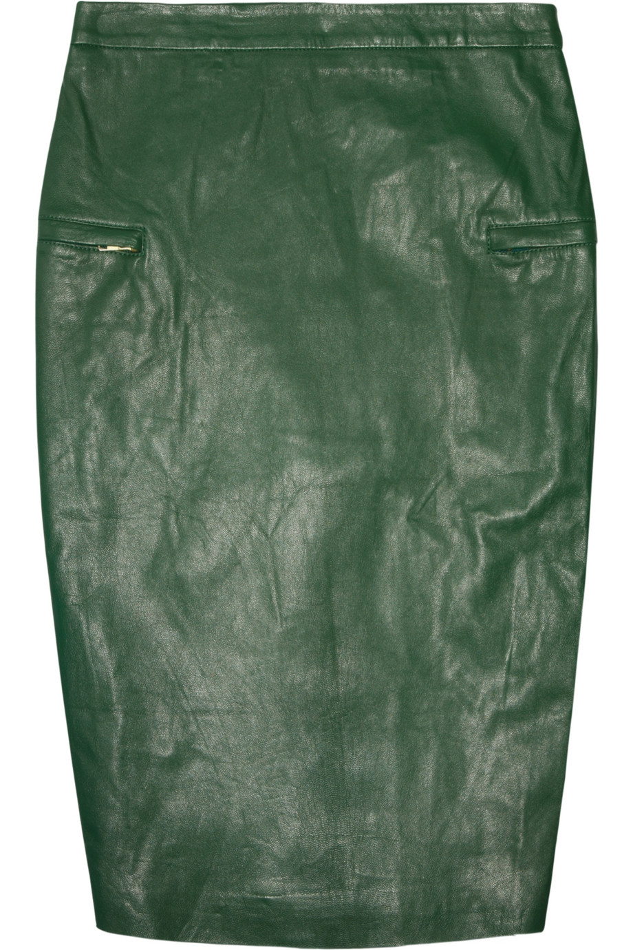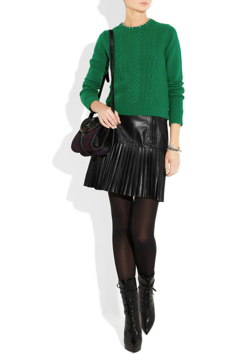 Váy da xếp ly kết hợp cùng áo len xanh lá