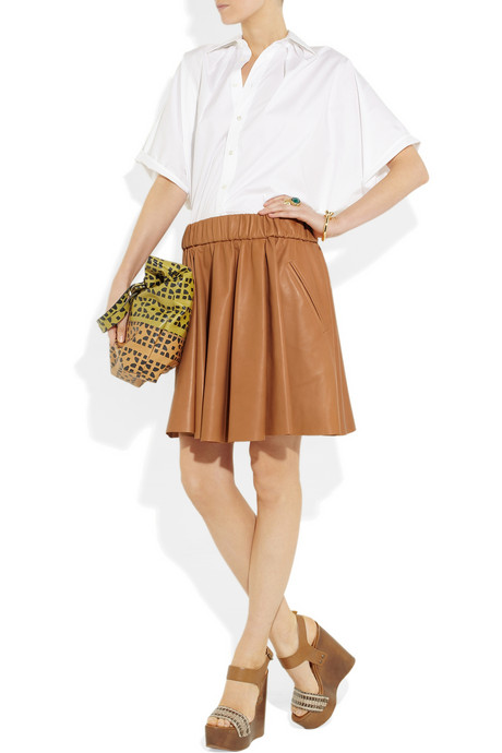 Váy xòe da màu camel kết hợp cùng áo cánh dơi trắng