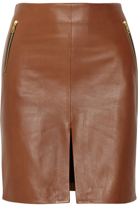 Váy da màu chocolate kết hợp cùng áo ánh kim
