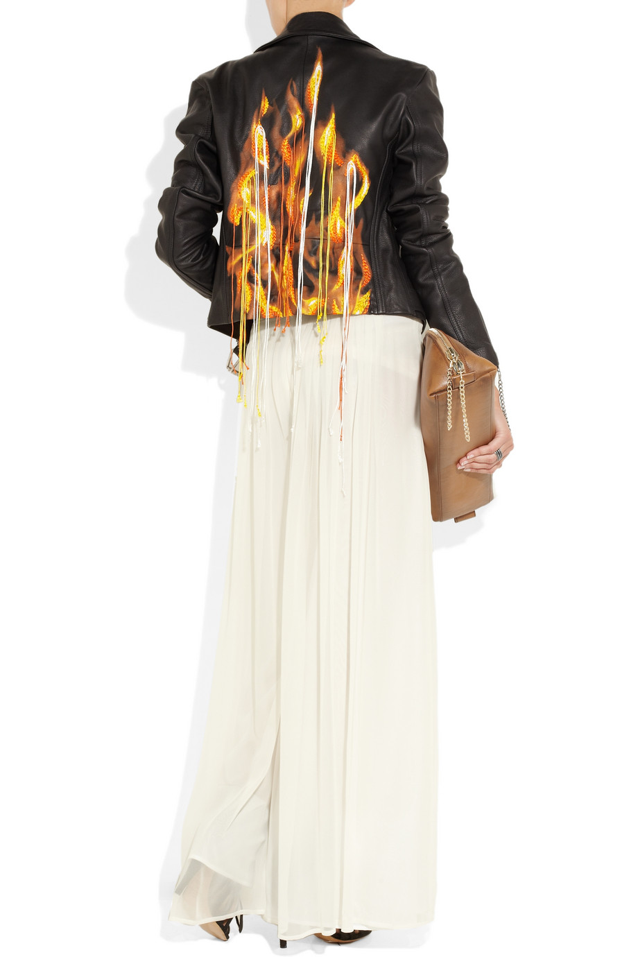 Áo khoác da hầm hố có phần lưng hình lửa cháy ấn tượng của Maison Martin Margiela (76 triệu đồng)