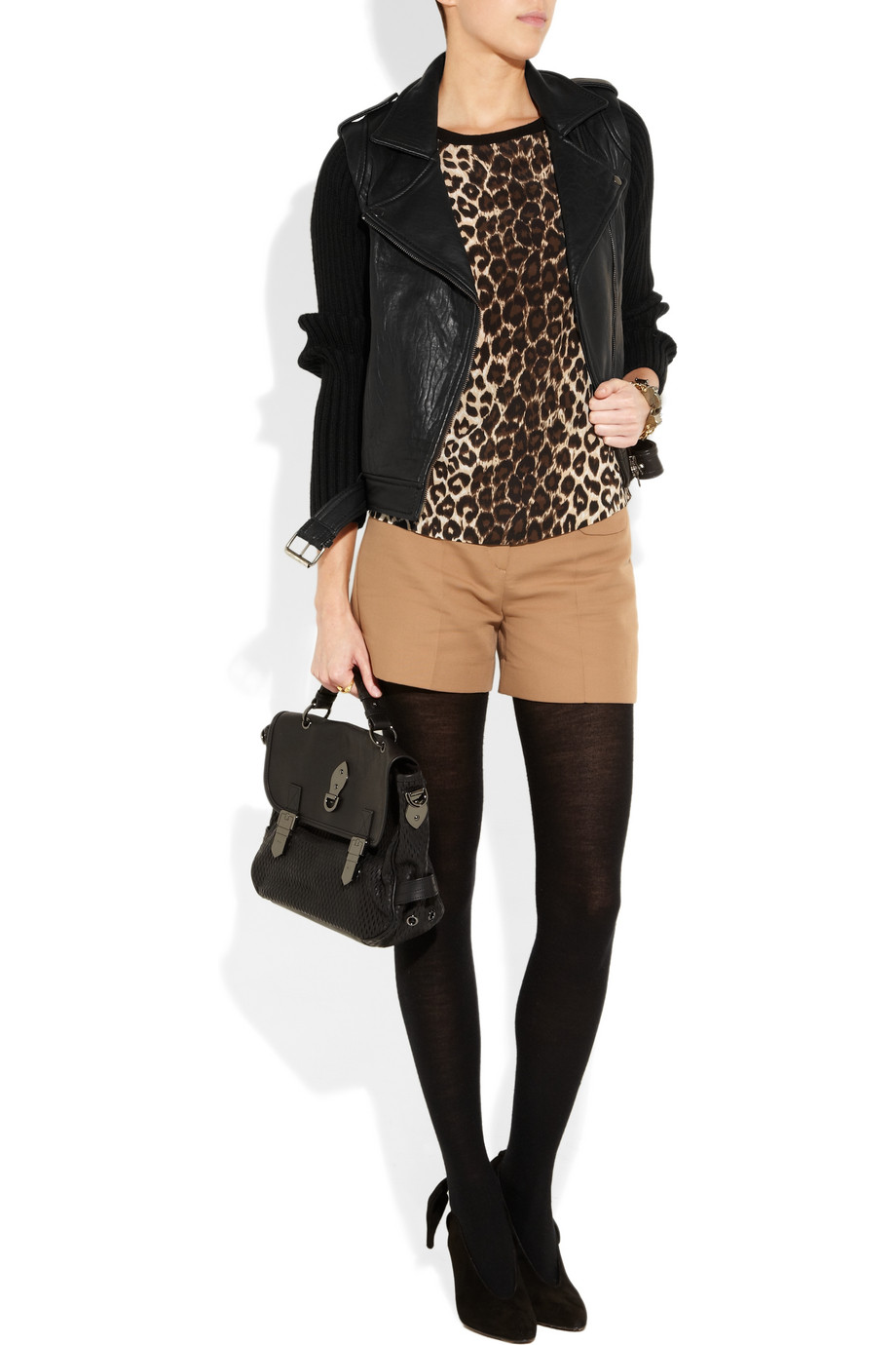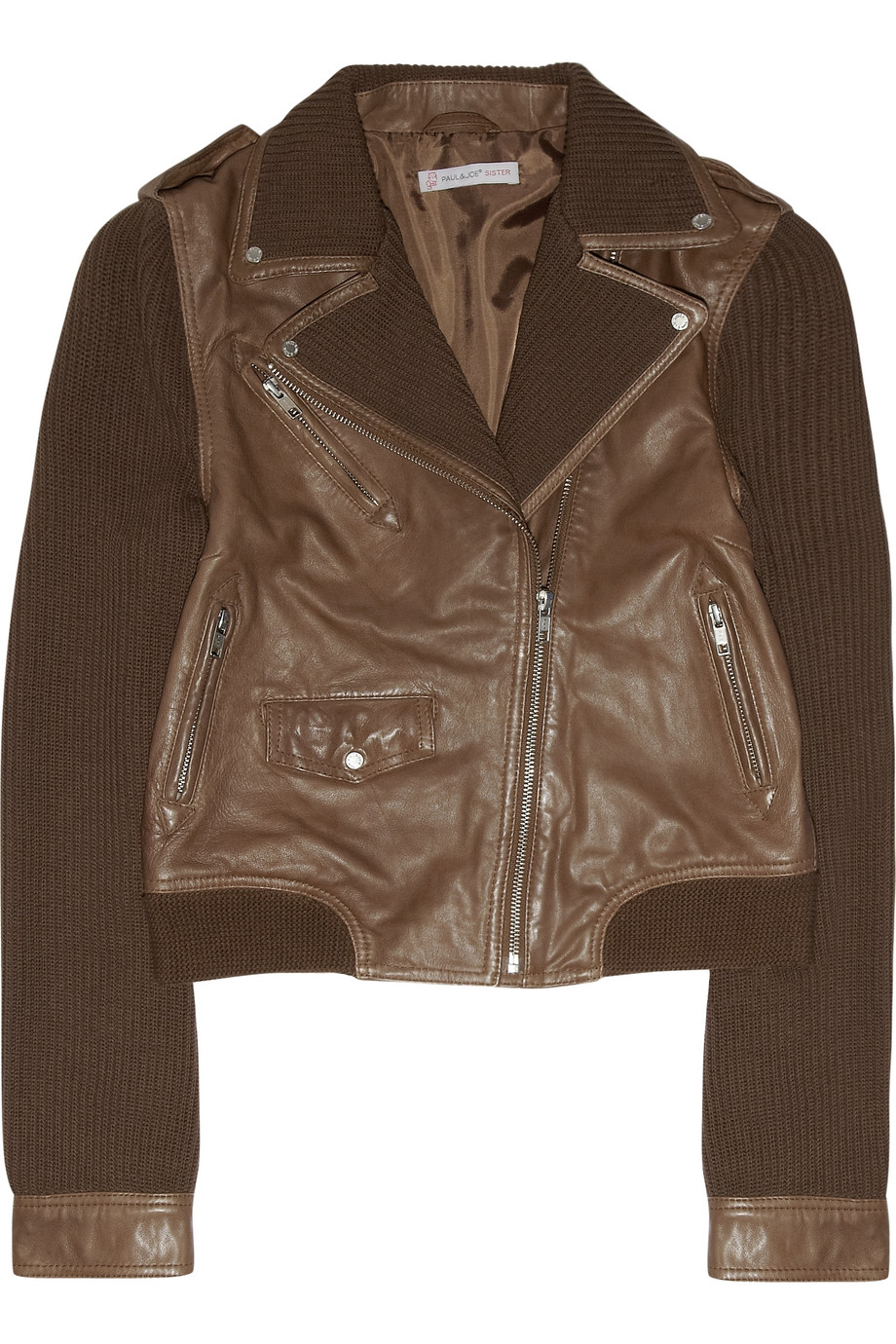 Áo khoác biker với sự pha trộn của nhiều loại chất liệu trên tông màu nâu trầm của Paul & Joe Sister (17 triệu đồng)