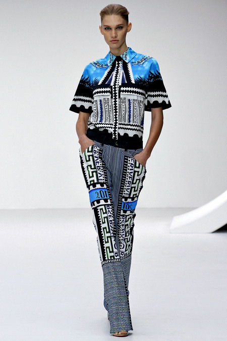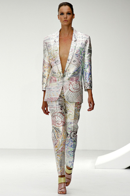 Thông qua bộ sưu tập Xuân Hè năm nay, Mary Katrantzou muốn thể hiện tình yêu của mình với những bộ sưu tập tem và tiền giấy của các quốc gia trên thế giới từ khi cô còn nhỏ. Đây là lần đầu tiên cô thử sức với kỹ thuật xử lý vải chéo nhưng đã đạt tới đỉnh cao của nó: bên cạnh việc thêu chỉ màu kim thuyến, pha lê còn được in trực tiếp lên vải với mục đích tạo màu sắc sáng và nổi đẹp mắt nhất. Những bộ vest với họa tiết trên các tờ tiền này đặc biệt dành cho những cô nàng yêu du lịch, thích khám phá và có vẻ đẹp của tri thức.