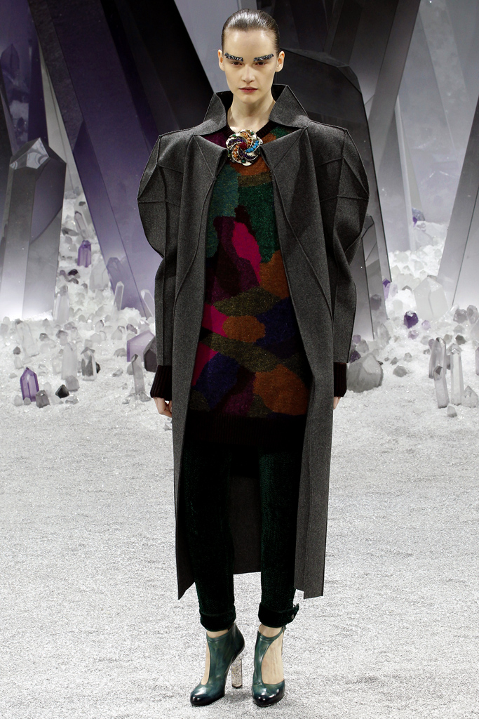 Nhà thiết kế Karl Lagerfeld lại thể hiện đẳng cấp bậc thầy của mình qua những mẫu áo khoác với được thiết kế trên kỹ thuật hình học 3D, lấy cảm hứng từ đá thạch anh khối tự nhiên. Cảm hứng từ đá thạch anh đã mang lại dáng vẻ khoẻ khoắn và đầy cá tính cho thương hiệu Chanel.