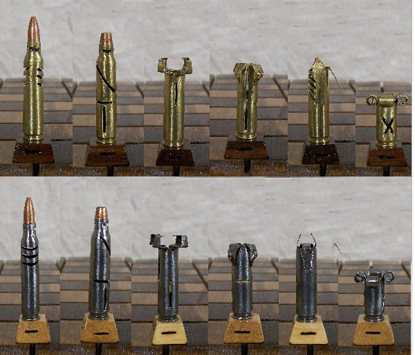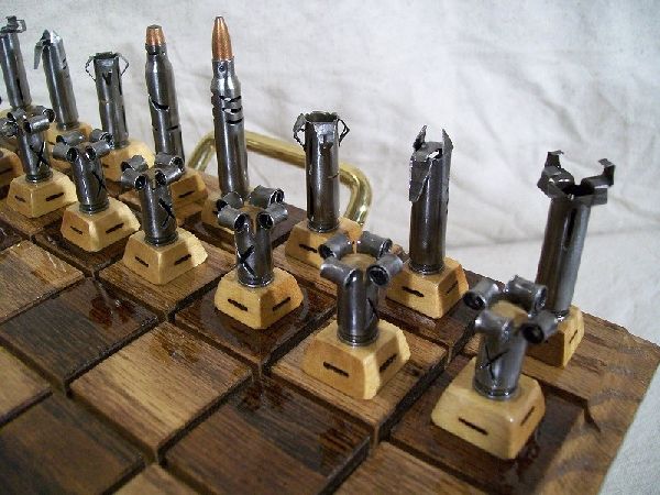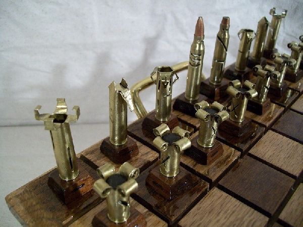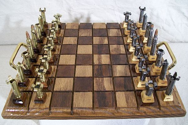Với mục đích tăng thêm kịch tính cho mỗi phút của cuộc chơi, bộ cờ vua Caliber.223 đến từ “Olde World Collectibles & Creations” được làm từ thép và vỏ đạn đã được sản xuất. Các quân trắng thì được thể hiện bằng màu sắc của lớp kim loại bóng tự nhiên, trong khi quân đen thì được sơn thủ công màu đen, riêng quân vua và quân hậu là những chiếc vỏ đạn thực sự.