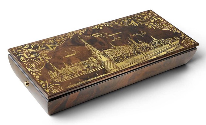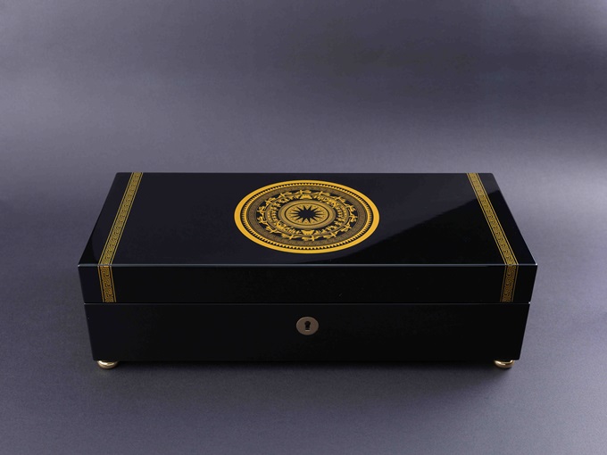 Càng tuyệt hơn nữa khi tất cả những điều đó được chứa trong một chiếc hộp làm bằng gỗ óc chó quý hiếm phủ sơn mài, mà phần nắp hộp được khảm hình trống đồng Đông Sơn – biểu tượng cho bề dày văn hóa bốn nghìn năm của Việt Nam. Reuge đã vô cùng tinh tế khi lựa chọn hình thức này cho vỏ hộp.