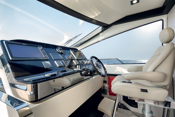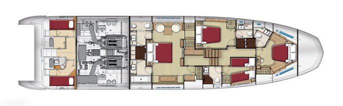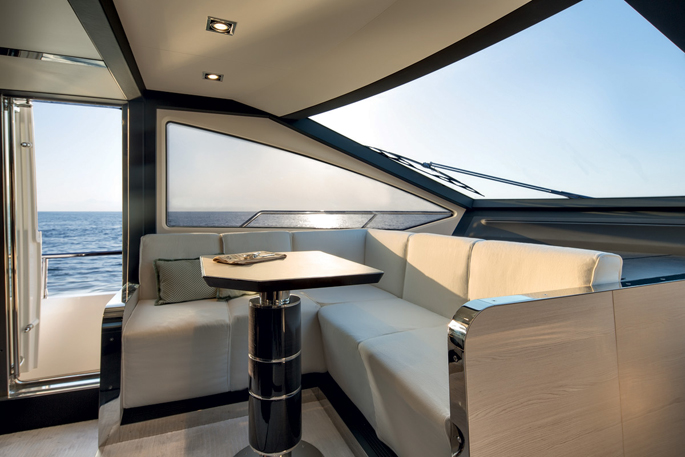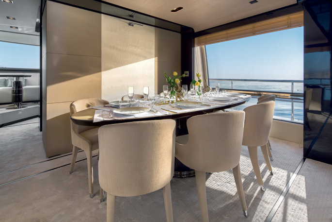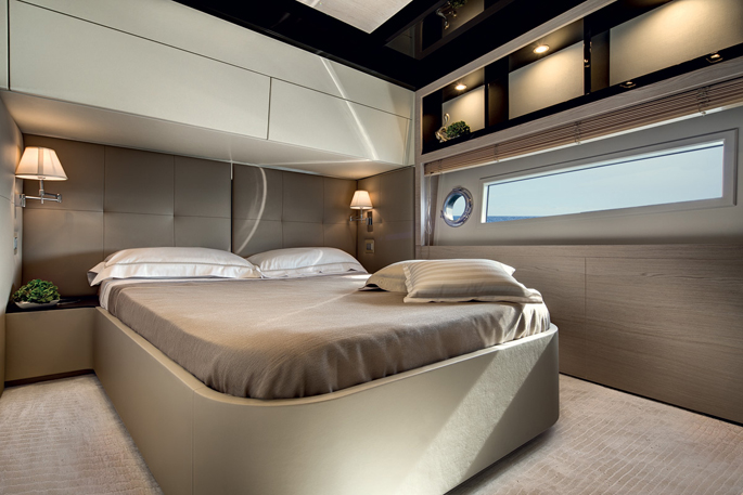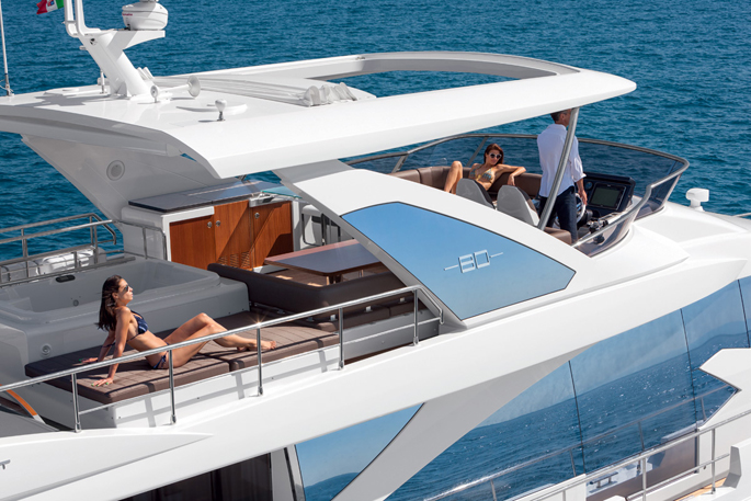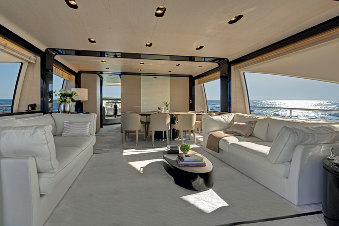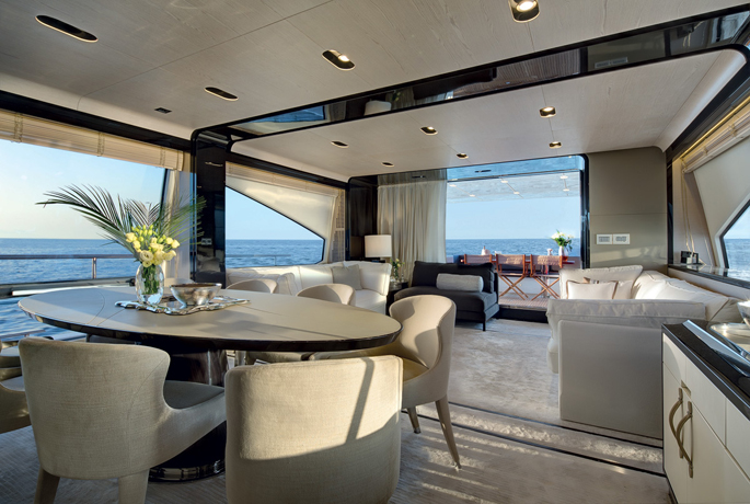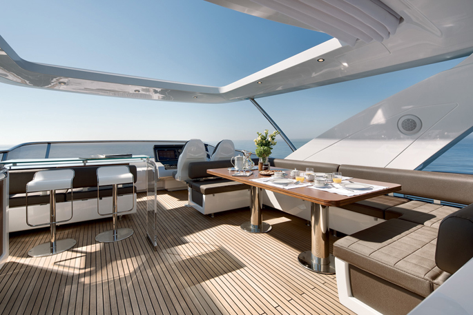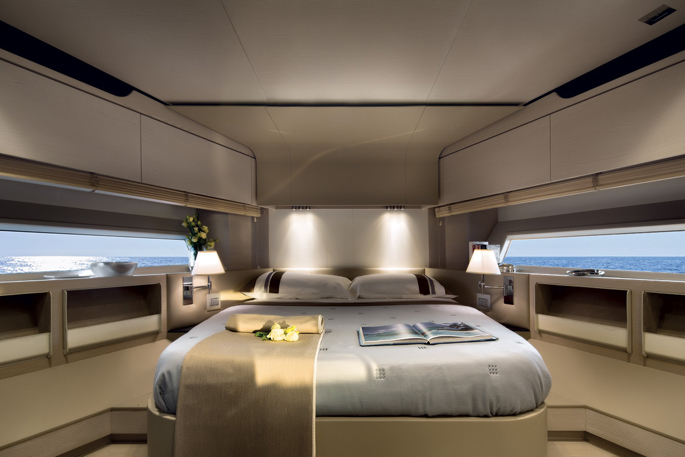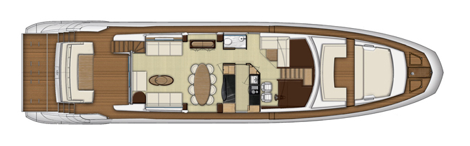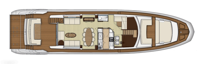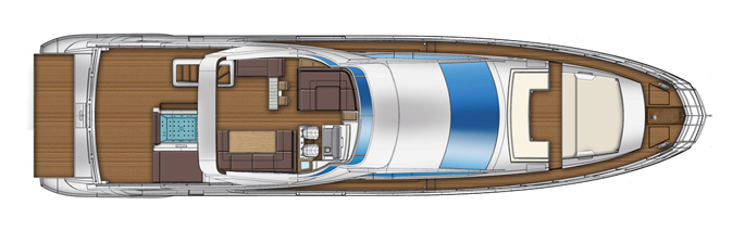 Mang ánh sáng đến cho 2 phòng VIP là 2 cửa được bố trí phía trước trên boong tàu, trong khi phòng chủ nhân có 6 ô cửa sổ lớn. Sàn phía trên buồng lái xuất hiện thanh lịch như salon ngoài trời, rất rộng rãi và biến nóc buồng lái thành một không gian sống thoải mái hơn. Sàn này có 2 ghế sô pha đối diện, một khu vực tắm nắng, giá gắn tàu tiếp liệu phía sau và một boong phía trước nhỏ hơn cho bếp, tủ điện, bồn rửa và tủ lạnh.