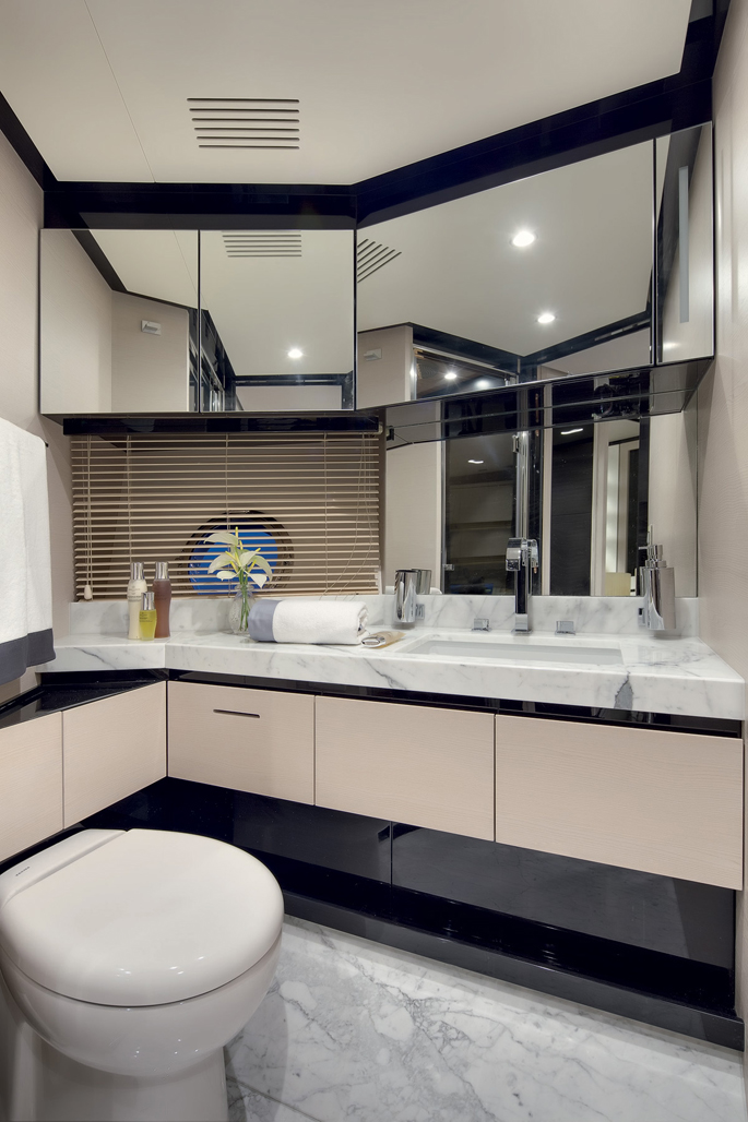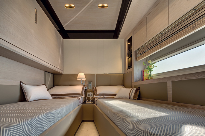 Du thuyền tuyệt đẹp này mang đến cuộc sống hiện đại và thoải mái với 4 cabin, 5 phòng tắm, đủ rộng để chứa 8 khách và một sàn rộng 42 mét vuông được thiết kế để sử dụng linh hoạt. Ngoài ra, Azimut 80 tự hào có các giải pháp sáng tạo về đồ nội thất và thiết kế ánh sáng chính xác.