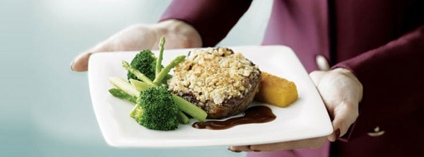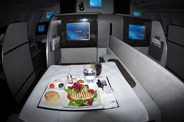 Khi chọn ghế hạng nhất của Qatar, bạn sẽ được phục vụ một bữa ăn với 10 món bao gồm một số món đắt đỏ như trứng cá muối, tôm hùm, socola đắng…