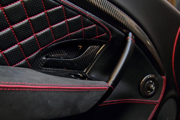 Nội thất xe cũng “đen” hơn với các chi tiết bằng sợi các-bon như tay nắm cửa, thông khí, các đường bo của nóc, các cạnh cửa, điều chỉnh ghế, tay lái, mặt trước của radio, bộ điều khiển chuyển số… Hệ thống âm thanh và điều khiển cũng được nâng cấp với hệ âm thanh theo ý muốn của khách hàng, màn hình điều khiển phía trên, một bộ PS3 với loa sub-woofer và âm ly cùng một loa to. Các chi tiết hoàn thiện nội thất xe là da Alcantara, sợi các-bon với điểm nhấn là các đường chỉ khâu màu đỏ ở viền các chi tiết.