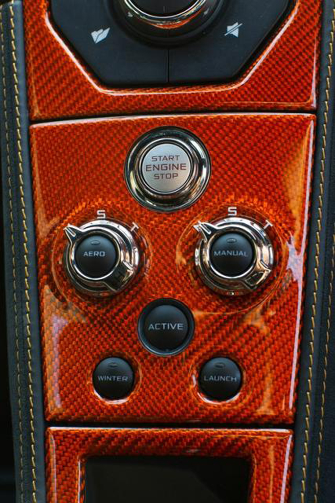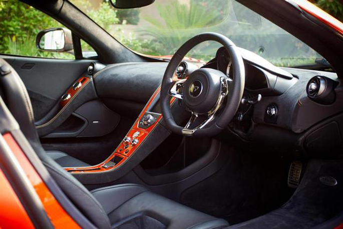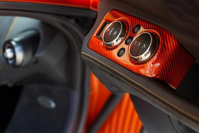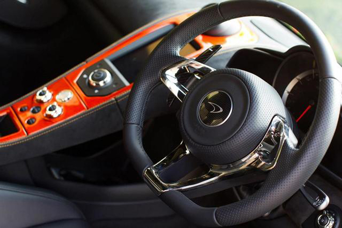 Nội thất của xe có tùy chọn bọc Alcantara và chỉ khâu màu cam Volcano Orange tương tự màu sơn ngoại thất. Đồng thời, nội thất cũng nổi bật các chi tiết bằng sợi các bon màu Volcano Orange ở cửa xe, mặt bảng điều khiển trung tâm. Một điểm nhấn thú vị là tấm biển nhỏ mang biểu tượng McLaren bằng sợi carbon xuất hiện trên tay lái.