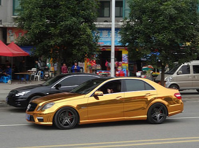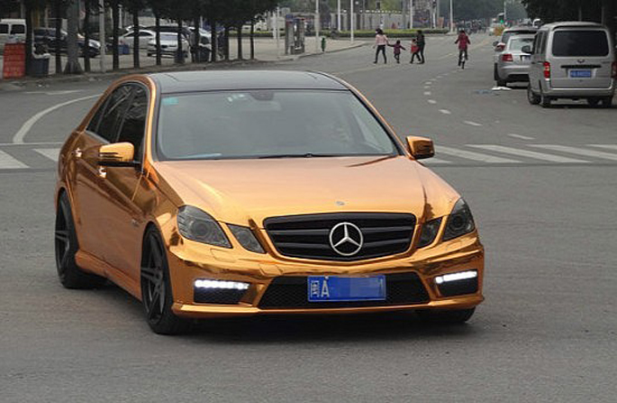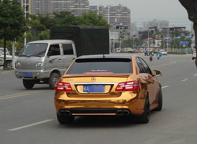 Đó là trường hợp của chiếc Mercedes-Benz E63 AMG ở Trung Quốc. Nó được bọc bằng chrome vàng với một mui xe đen bóng tương phản. Màu sắc này thật phù hợp với chiếc xe và ý tưởng xa hoa, sang trọng mà Mercedes-Benz muốn truyền tải qua những chiếc xe.
