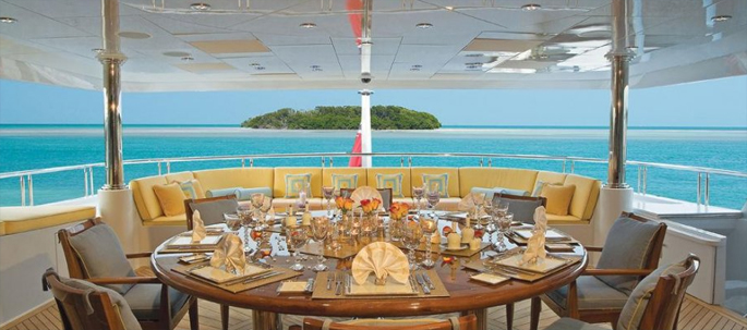 Bàn ăn tùy chỉnh được xây dựng trên boong tàu phía sau có chỗ cho 12 khách ăn ngoài trời.