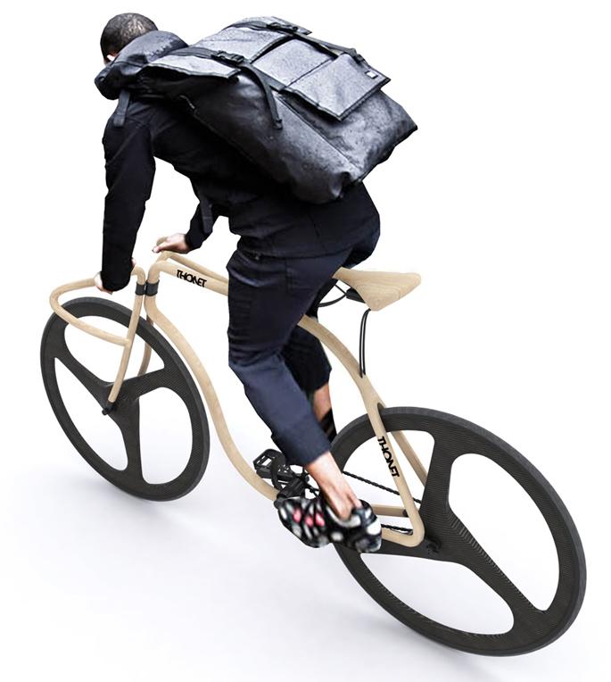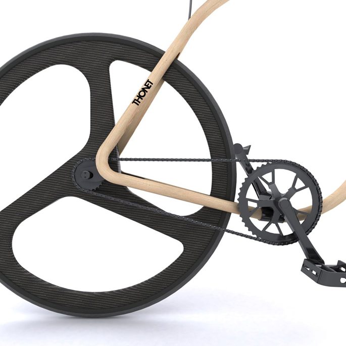 Khung xe đạp với đường nét tinh tế làm từ gỗ sồi được hấp và uốn cong bằng cách sử dụng quá trình uốn hơi nước phát triển từ những năm 1930 để làm ra những chiếc ghế mang tính biểu tượng của Thonet.