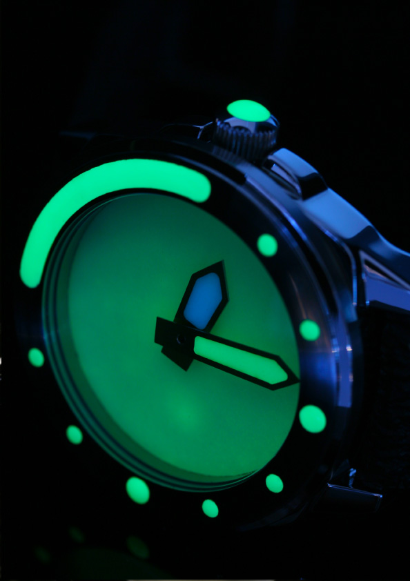 [Chất liệu] Émail Lumineuse: Loại dạ quang do Angular Momentum (AM) phát minh. Nó là sự kết hợp của men sứ với chất tạo màu có khả năng phát sáng nhanh và mạnh. Émail Lumineuse có chức năng gần giống như chất dạ quang Super-LumiNova thường sử dụng để phủ lên kim và số trong công nghiệp đồng hồ nhưng phát sáng mạnh hơn nhiều. Chỉ cần 10 phút phơi “Émail Lumineuse” dưới ánh nắng mặt trời hoặc một nguồn sáng nào đó sẽ cho phép chất này phát sáng trong 35 giờ liên tục. Dưới ánh sáng ban ngày, chất này có màu vàng vani và chuyển sang màu xanh lá cây nhạt vào ban đêm giống như loại nấm Mycena.